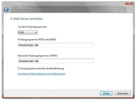 Gebe den Typ des Posteingangsservers (POP3 oder IMAP) und die Adresse des Posteingangs- und Postausgangsservers ein (Der Domänenname, ohne www., z. B. yourdomain.com).